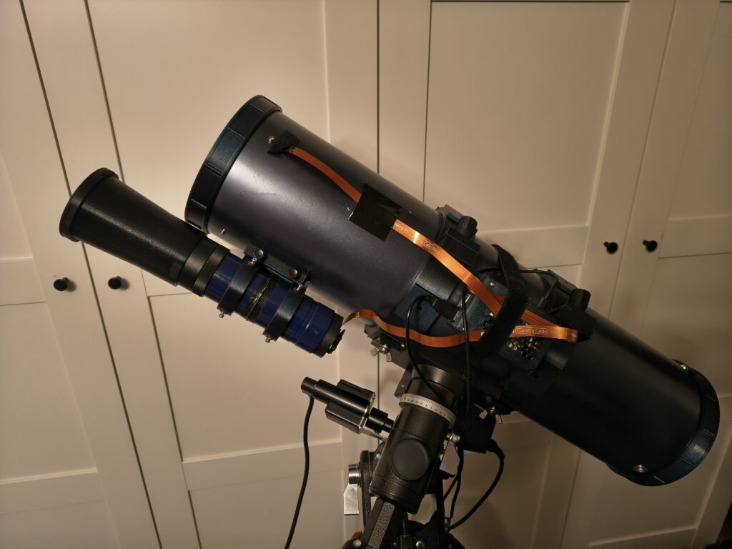 • Als Montierung verwende ich eine alte Vixen-NP, die ungenutzt rum lag mit alten Vixen NP1-Schrittmotoren mit 1:120 Getriebeuntersetzung. Die Montierung trägt das Teleskop zuverlässig, ist damit aber ausgelastet.